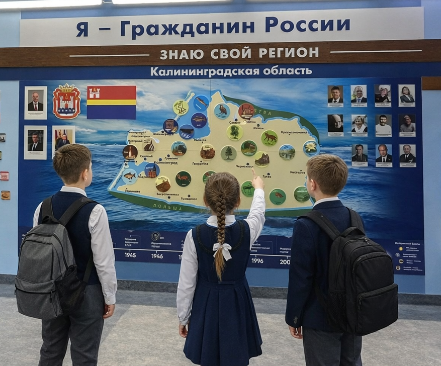 Особенно ценно, что частью этого пространства стала интерактивная карта Калининградской области, созданная Екатериной Санкиной, ученицей 10 класса МБОУ СОШ «Школа будущего». Именно эта идея легла в основу регионального направления и получила дальнейшее развитие уже как часть большого образовательного пространства школы. На плакате проекта отдельно показано, что карта вошла в состав центра патриотического воспитания и гражданского становления.